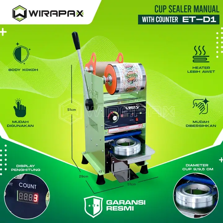 Cup Sealer Manual ET-D1 Mesin plastik cup sealer / Mesin press plastik gelas kini sering kali digunakan oleh para pedagang minuman modern di zaman sekarang. Alasannya sederhana, karena tutup cup kovensional lebih sering mengalami kebocoran ketika dibawa atau dijinjing oleh pembelinya.