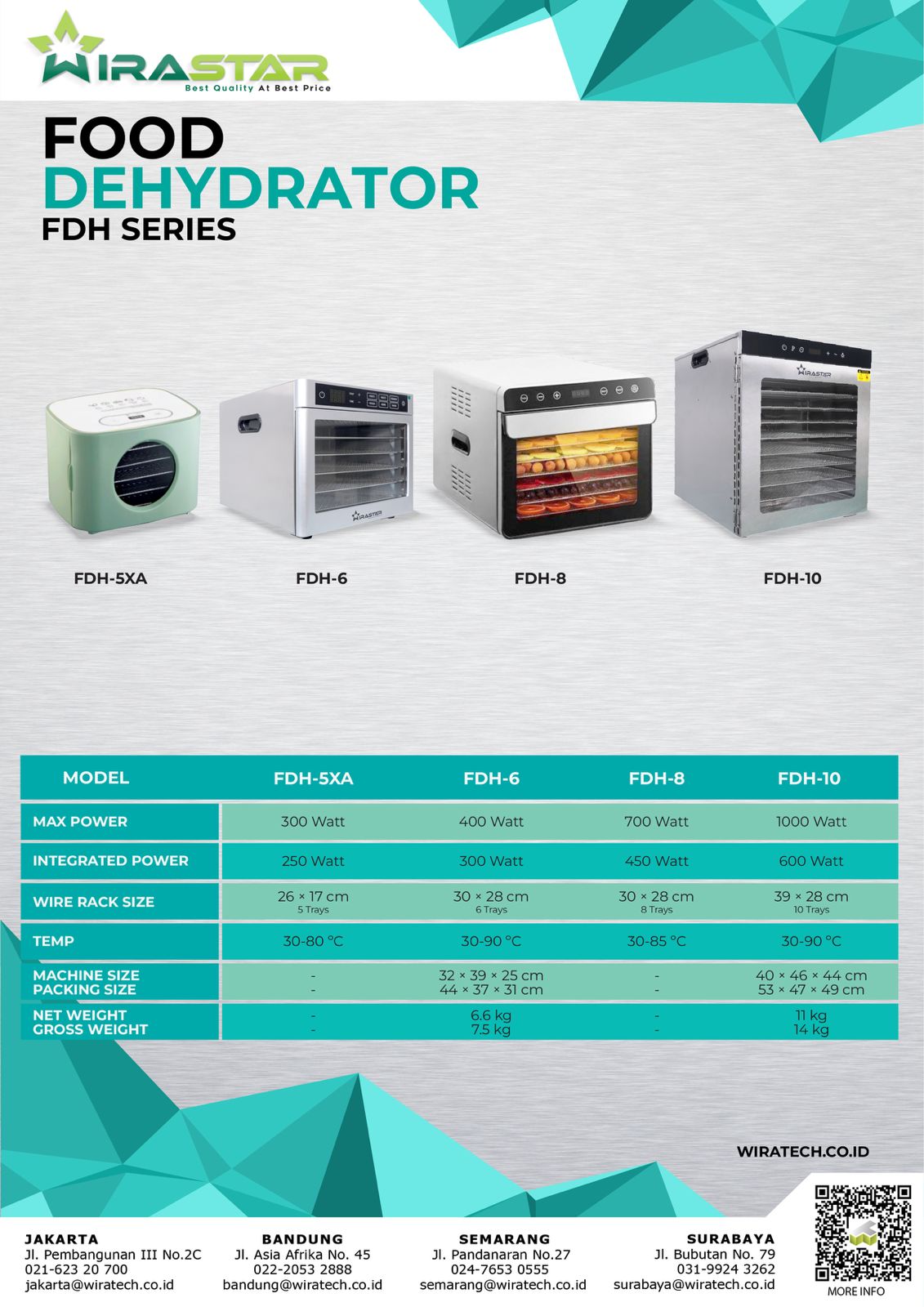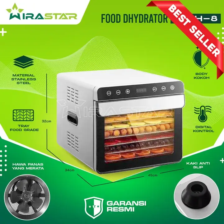 Food Dehydrator 8 Tray FDH-8 menghadirkan kapasitas besar dan kontrol suhu presisi untuk menghasilkan aneka camilan kering yang sehat dan renyah. Jika Anda membutuhkan solusi pengering makanan yang efisien untuk skala rumahan hingga usaha kecil, pilihan food dehydrator ini dapat Anda cek melalui website Wiratech.