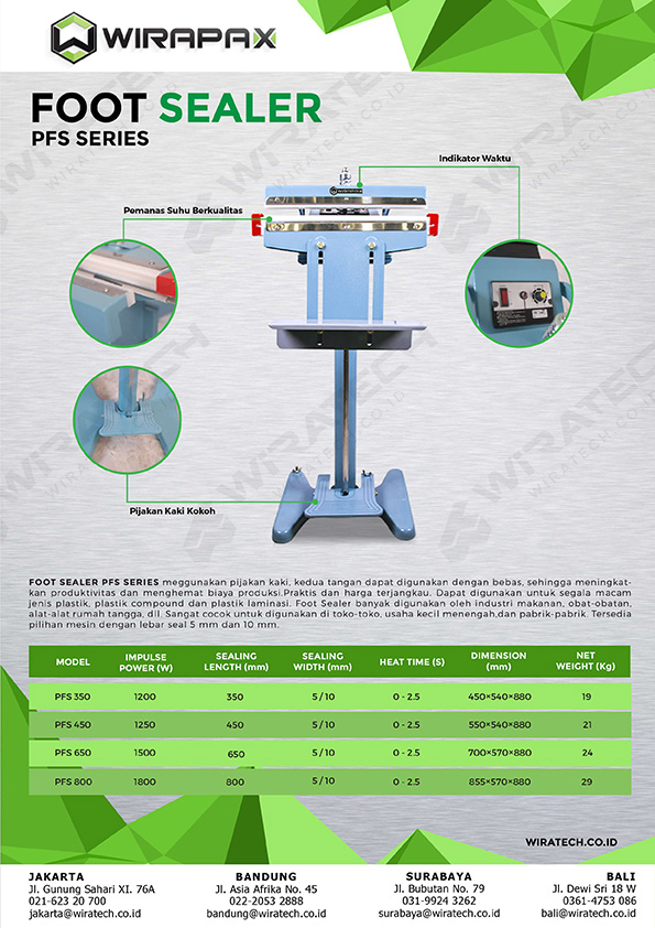 Foot sealer merupakan alat yang dimanfaatkan untuk melakukan pengemasan produk dengan menggunakan pijakan kaki. Bagi yang belum mengetahui, mesin tersebut bisa digunakan untuk berbagai bahan sama seperti mesin vacuum sealer. Bahan plastik yang paling utama digunakan memiliki material dasar PVC, PE, PP, dan PET.