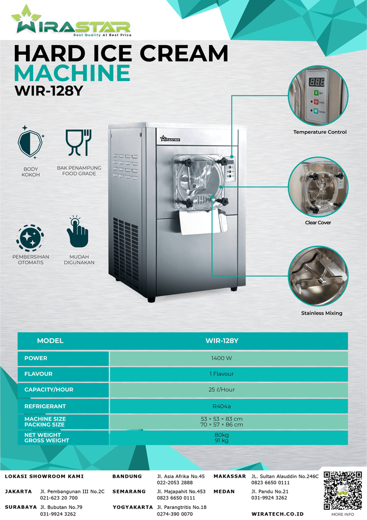 Kami menjual Mesin Hard Ice Cream Machine WIR-128Y, ini merupakan mesin pembuat es krim untuk tipe Hard Ice Cream. Hard Ice cream sendiri seringkali di gunakan dalam pembuatan menu es krim dengan tekstur lebih padat, seperti Gelato,Sorbet,dll. Mesin Hard ice Cream ini mempunyai power output hingga 2000 Watt yang sanggup mengolah 1 flavor / rasa sebanyak 25 liter/jam. Mesin ini mempunyai bobot kosong sebesar 88kg dengan dimensi 52 x 57 x 78 cm