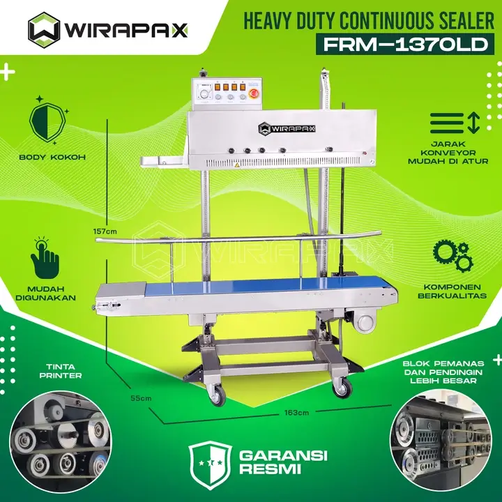 Continuous Sealer merupakan barang yang tidak lagi asing bagi yang memiliki home industri atau bisnis rumahan. Alat tersebut melakukan proses pembungkusan yang berukuran kecil dengan mengunakan sistem pengendali suhu. FRM-1370LD dapat menyegel semua jenis bahan yang dapat disegel panas, yang mengadopsi sistem kontrol suhu konstan dan mekanisme transmisi penyesuaian kecepatan tanpa langkah. Mesin ini bekerja dengan pembuat kode tinta padat untuk mencetak label berwarna sambil menyegel.