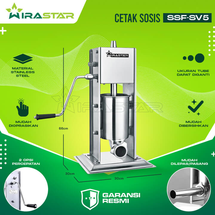 Mesin Sosis SSF-SV5 memiliki kapasitas dengan daya tampung 5 liter atau 11LB. Hal tersebut disesuaikan dengan kebutuhan Anda yang memiliki usaha frozen food rumahan atau bisnis kecil-kecilan. Daya tampung yang masih sedikit ini cocok Anda manfaatkan sebagai awal dalam merinstis. Mesin ini memiliki material yang aman digunakan dalam mengolah daging.